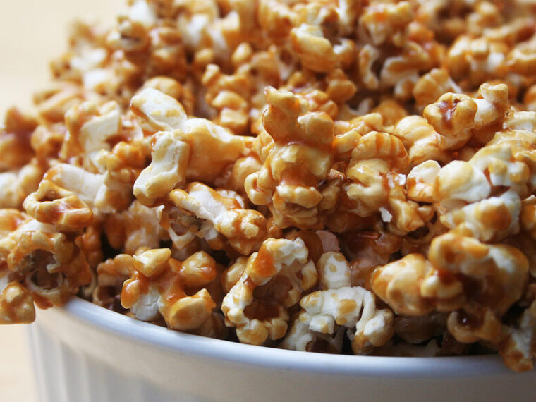 - Déposer le maïs soufflé dans un bol, verser le caramel puis bien mélanger le tout à l’aide d’une spatule (attention, c’est chaud !)